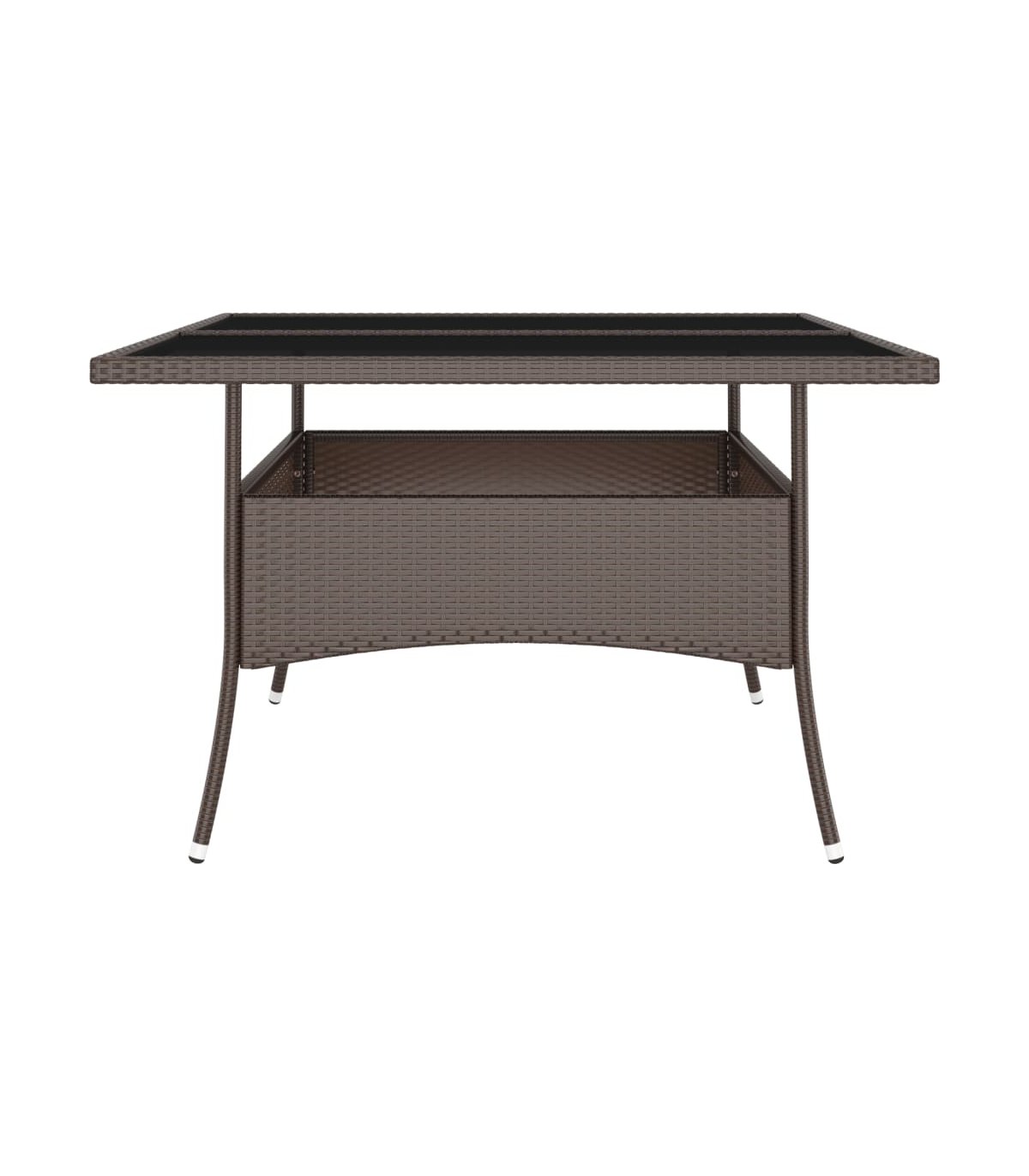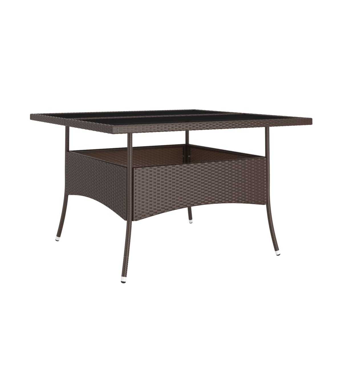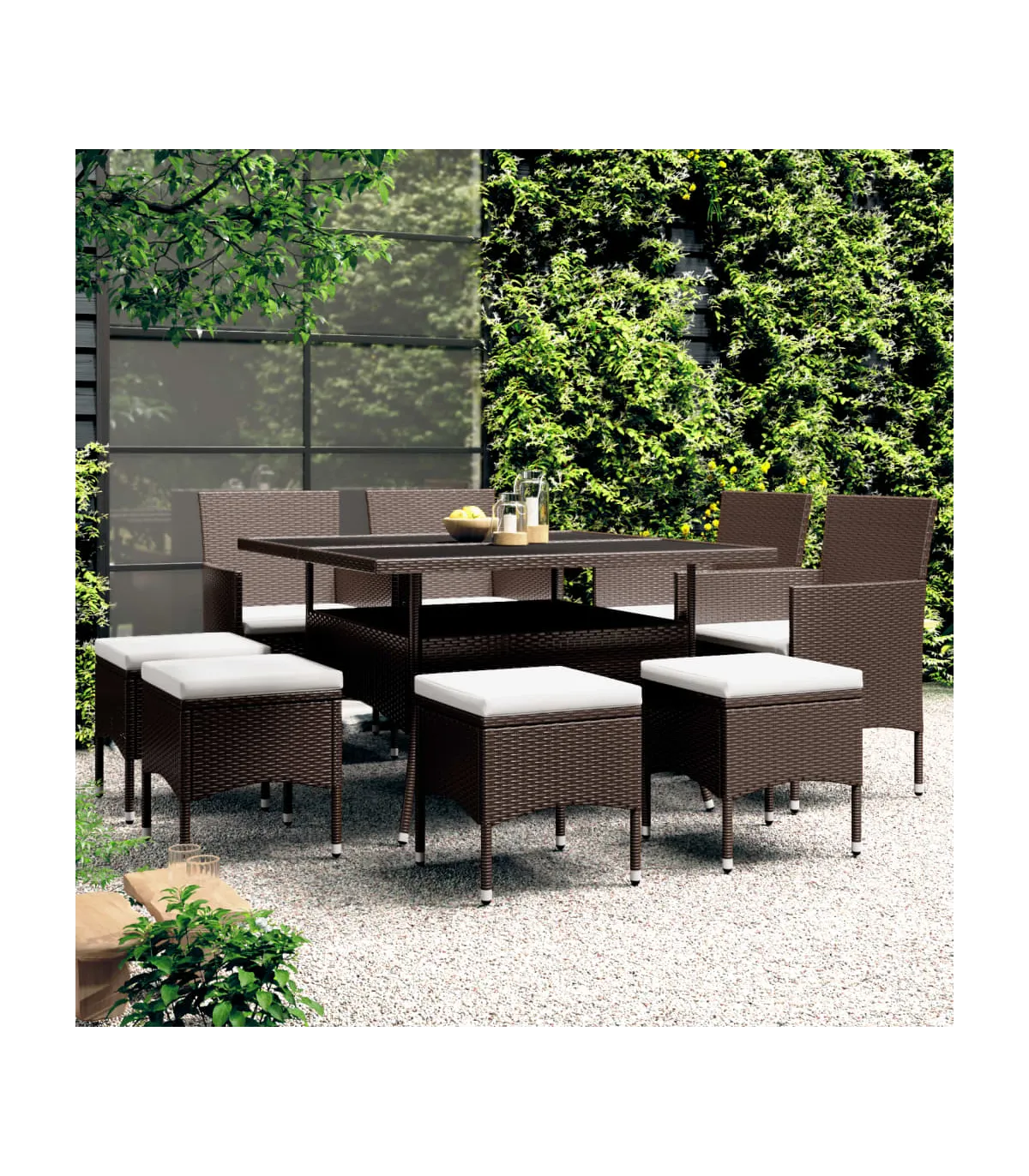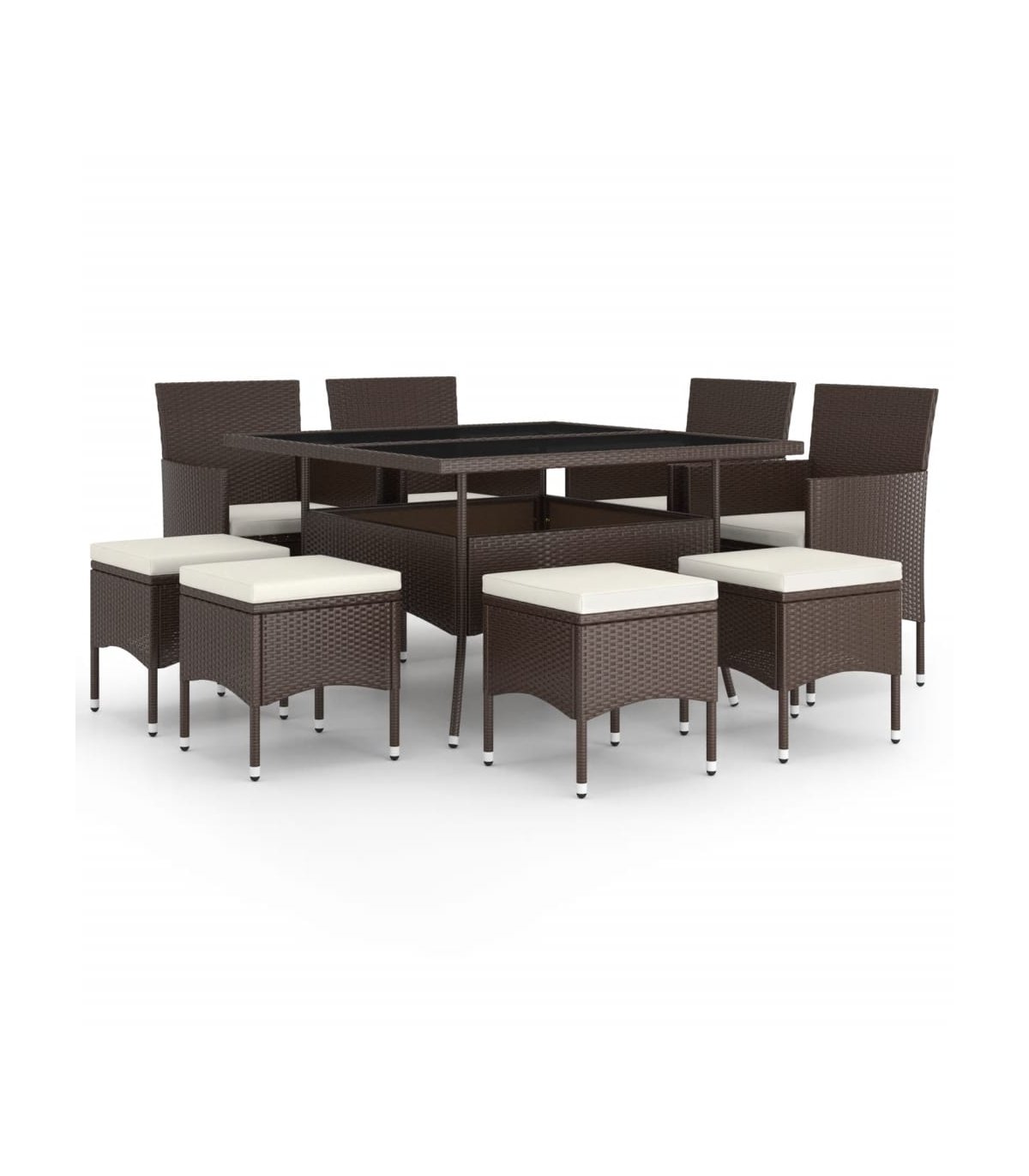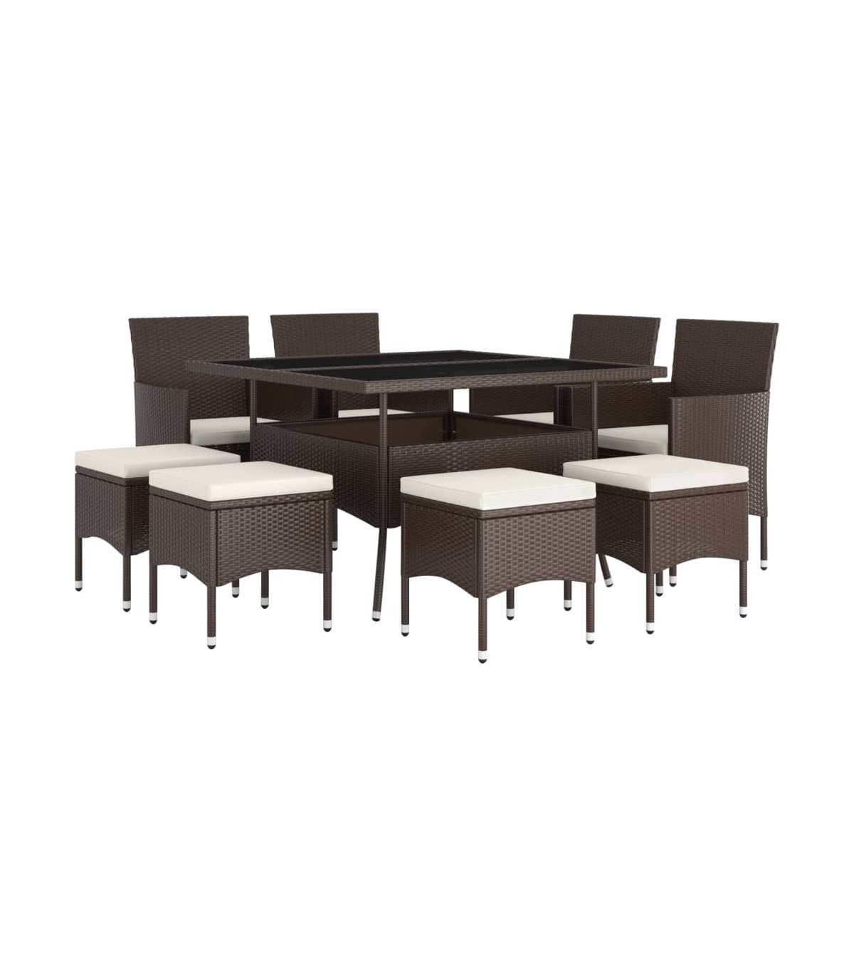 Este elegante juego de comedor para el jardín te brinda momentos agradables y cómodos con tu familia y amigos. Con una estructura de acero con recubrimiento en polvo cubierta con ratán PE resistente a la intemperie y protección UV, la mesa y las sillas son duraderas y estables. Diseñadas con reposabrazos y respaldo curvado, las sillas son muy cómodas. Se incluyen cojines para una mayor comodidad y la funda de cremallera se puede quitar para facilitar la limpieza. La superficie de la mesa está hecha de vidrio templado reforzado con un soporte fuerte, por lo que es fácil de limpiar y de cuidar. Los cuatro reposapiés también pueden servir de asiento. Asimismo, la construcción ligera hace que cada pieza sea fácil de mover, reorganizar y transportar. Nota: Para prolongar la vida de tus muebles de exterior, te recomendamos que los protejas con una funda impermeable.