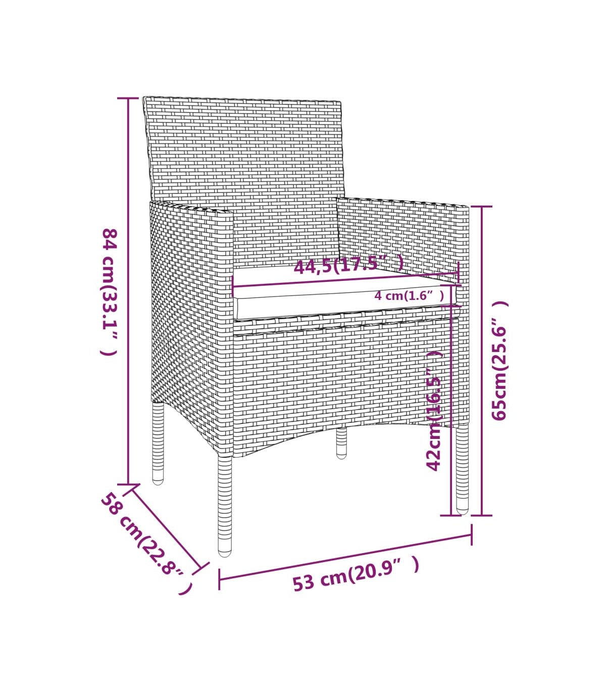 - Dimensiones de la silla: 53 x 58 x 84 cm (ancho x profundo x alto)